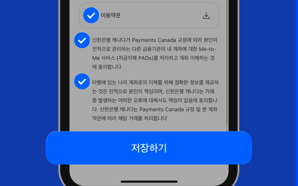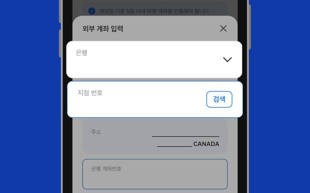 6단계 : 다른 은행명을 선택하고 지점 번호를 입력하세요.‘검색’ 을 눌러 계좌 정보를 확인하세요.계좌 소유자 이름은 신한은행 캐나다에 등록된 본인의 법적 이름과 정확하게 일치해야 합니다.